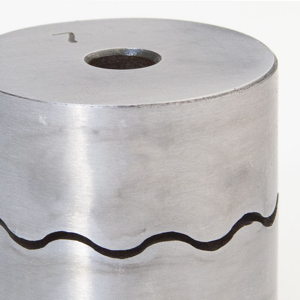 Form scallop or wavy patterned wire shapes without the need for an expensive hydraulic press. All you need is some soft non-ferrous wire (copper, brass, silver, etc.), a weighted brass or rawhide mallet, and a Ring & Hoop Forming Press. Each press consists of two interlocking solid steel halves and a steel collar with keyway that surrounds them. Choose one of several patterns or combine patterns for more interest. Create hoops or other shapes within a range of diameters from 1/2" (13 mm) to 1-3/8" (36 mm). Each press is 1-7/8" (46.8 mm) high by 2" (49.7 mm) in diameter. Made in India.